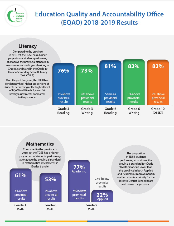To learn more about EQAO and OSSLT and to see the full 2018-19 results, visit www.tdsb.on.ca/research/Research/Achievement-EQAO.